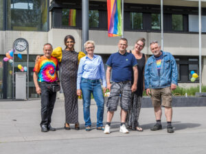 Michael Lämmert, Joelie International, Sabine Groß, Bürgermeisterin, Claus Brück und Anke Teckentrup, beide im Vorstand der Aidshilfe Offenbach, Franz Frank